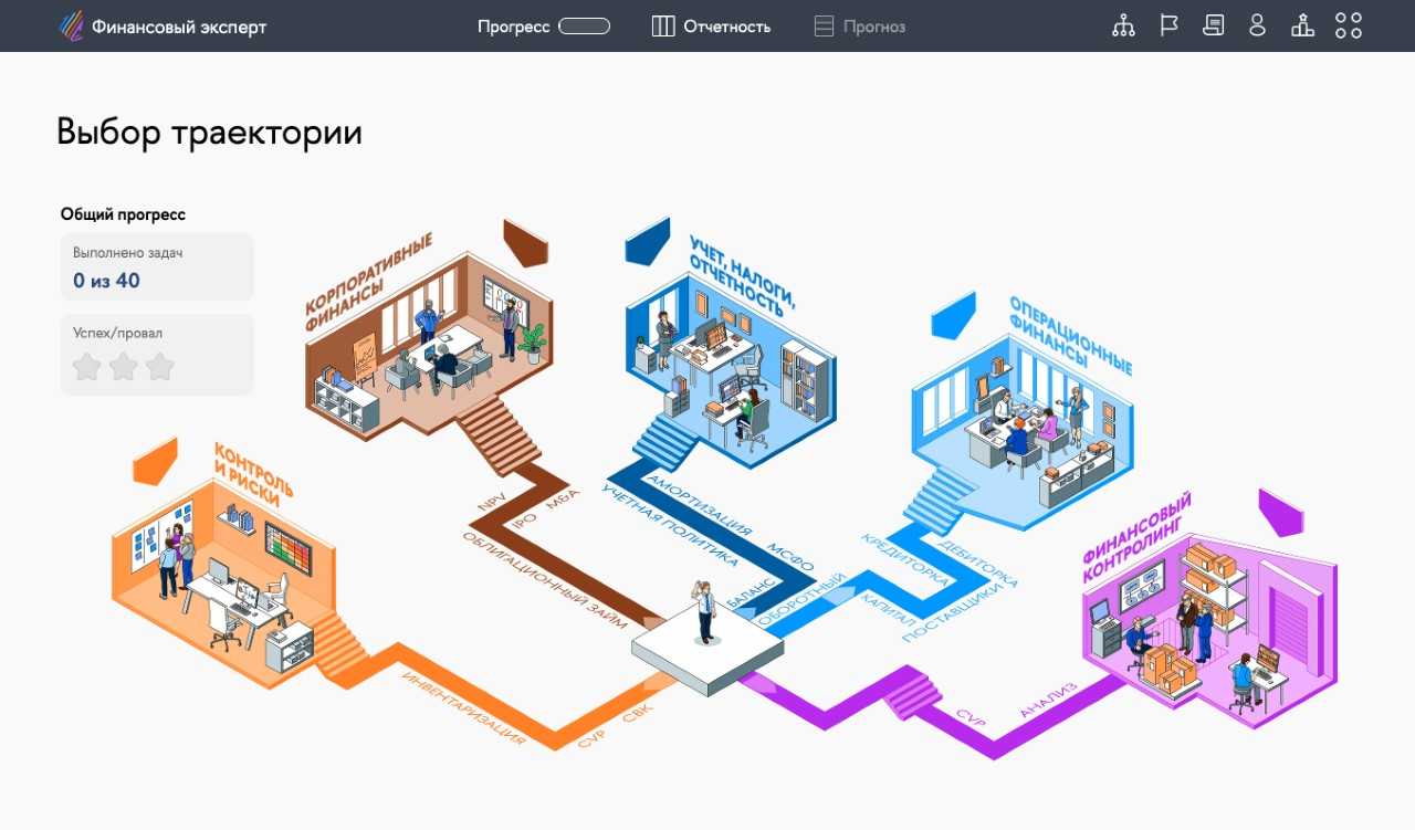 «Финансовый эксперт» — комплексная образовательная платформа, позволяющая обучать и формировать профессиональные компетенции в безрисковой виртуальной среде с развивающей обратной связью по результатам принятых решений. Обучающийся-игрок, получая доступ к платформе, может в удобное время в онлайн-формате выбрать один из пяти профессиональных треков и построить свою виртуальную карьеру.